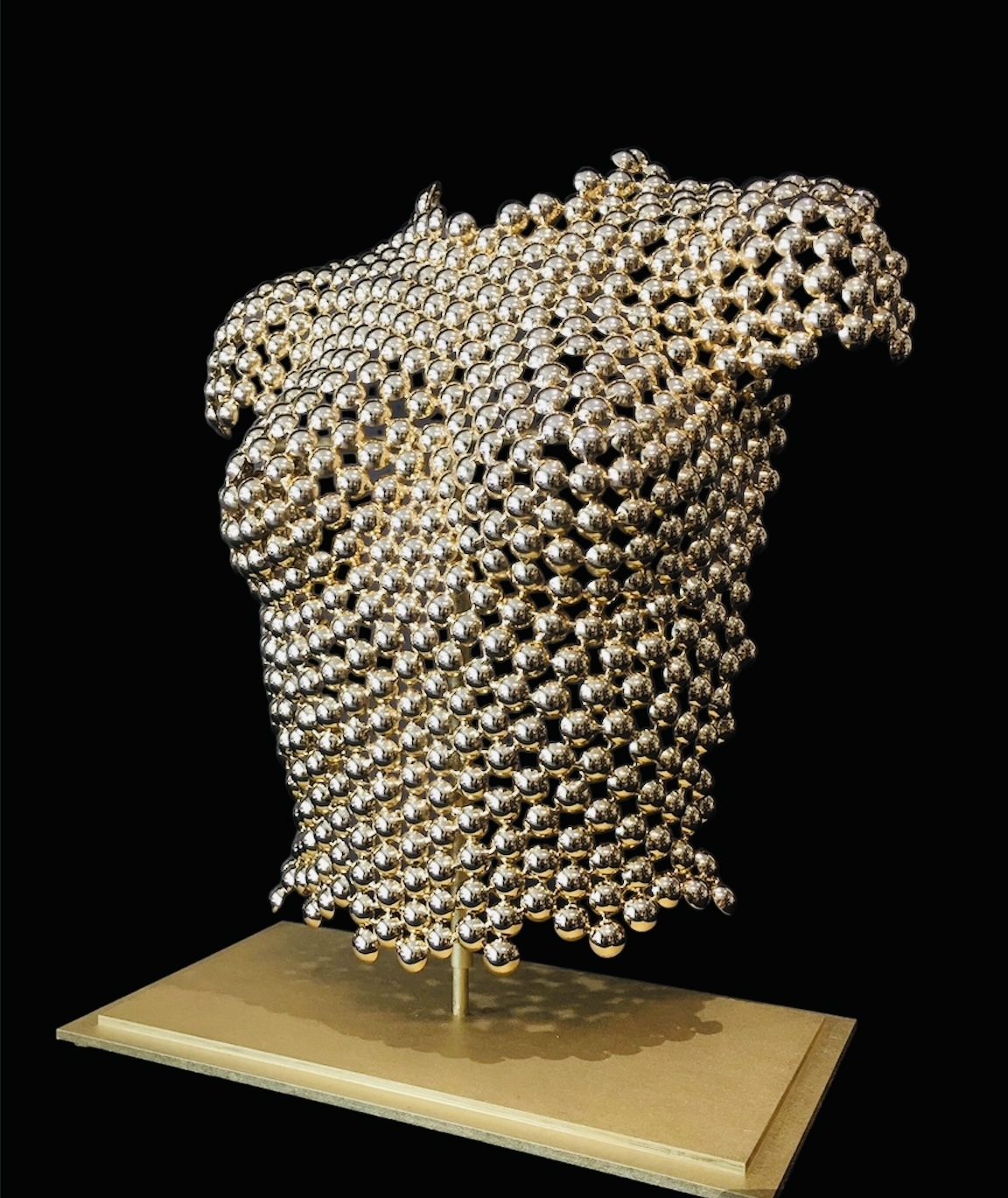 Buste réalisé en demi sphères de laiton et plongé dans des bains d'or fin 24 carats sur socle en acier or poudré.