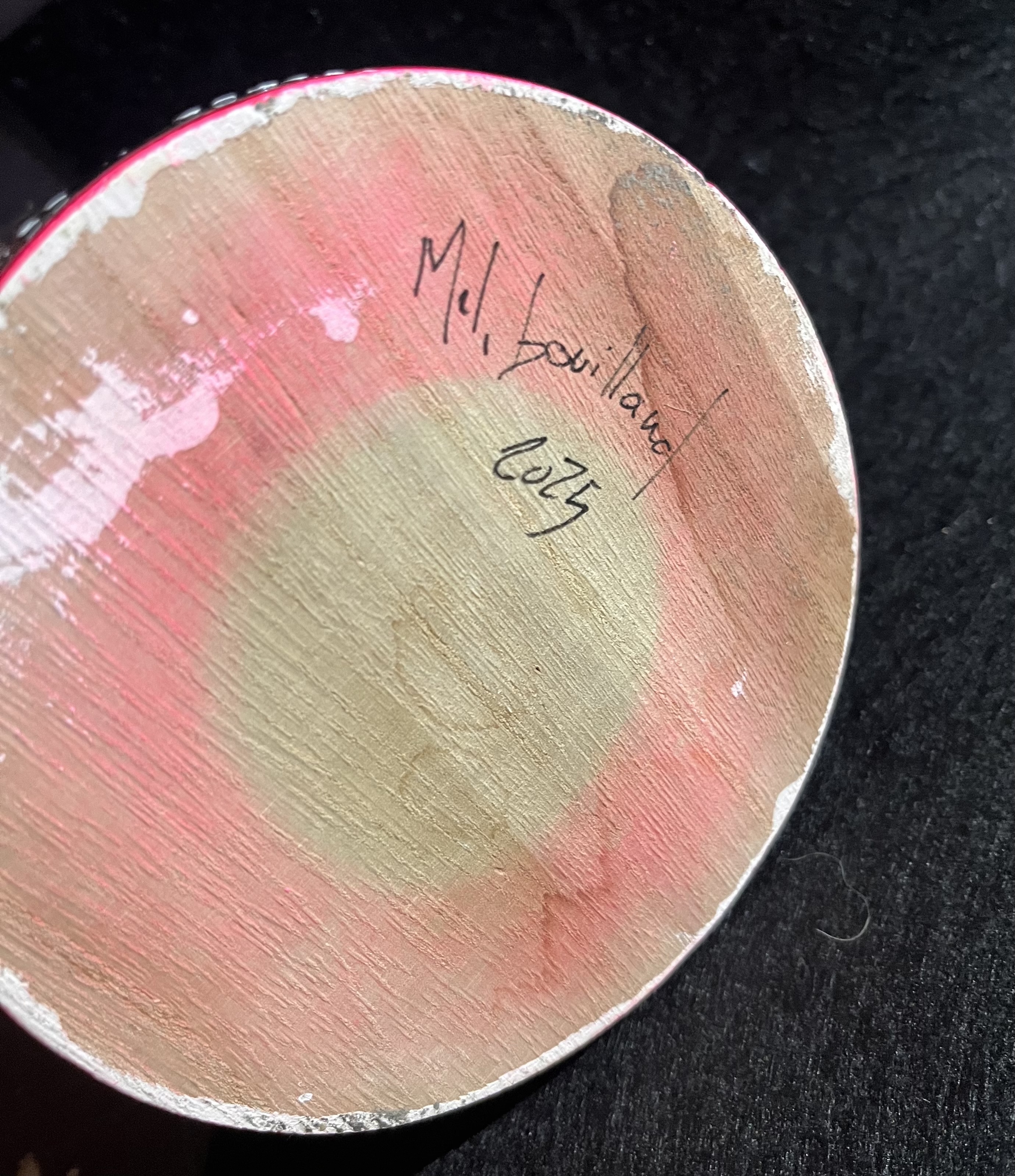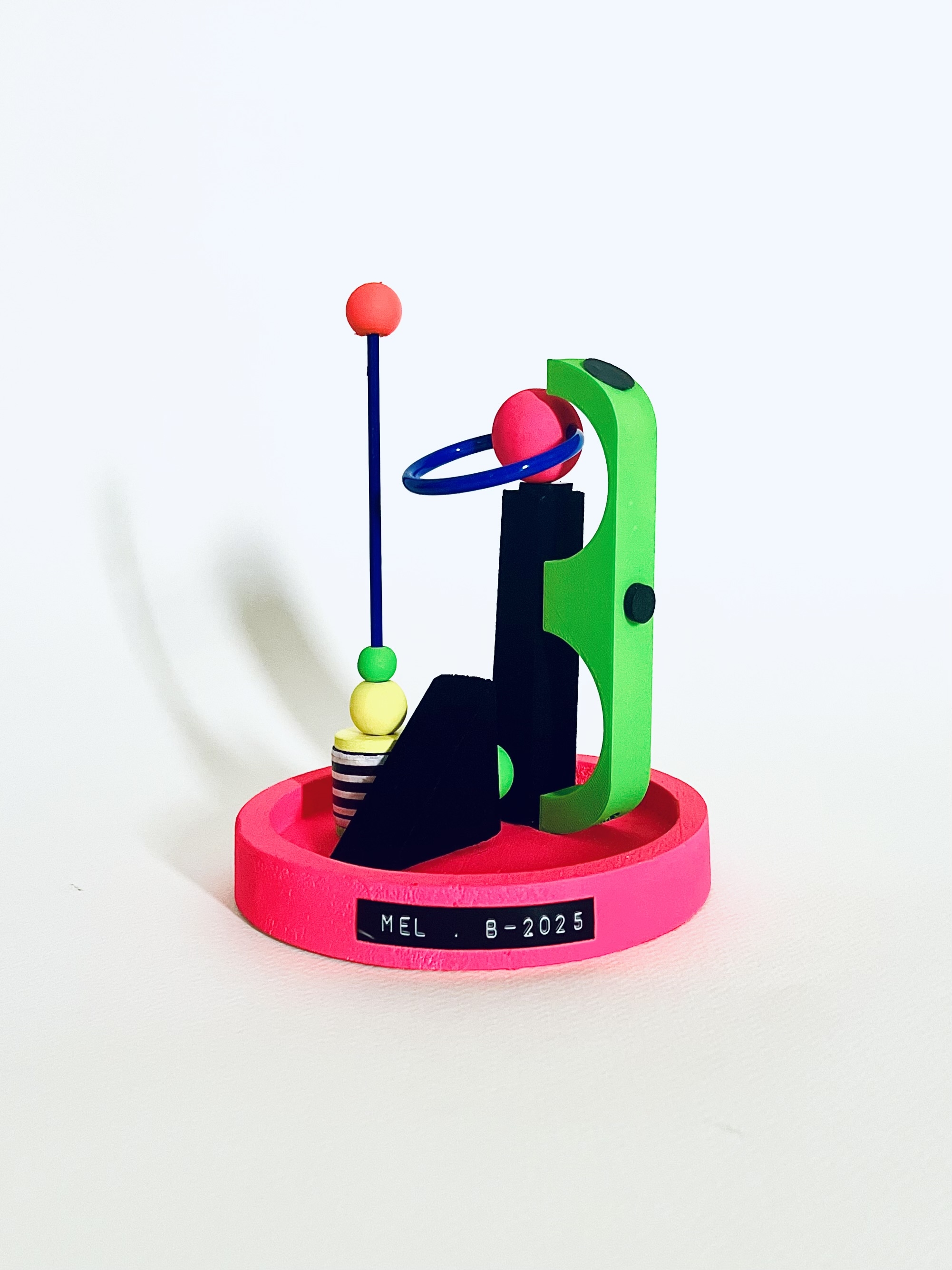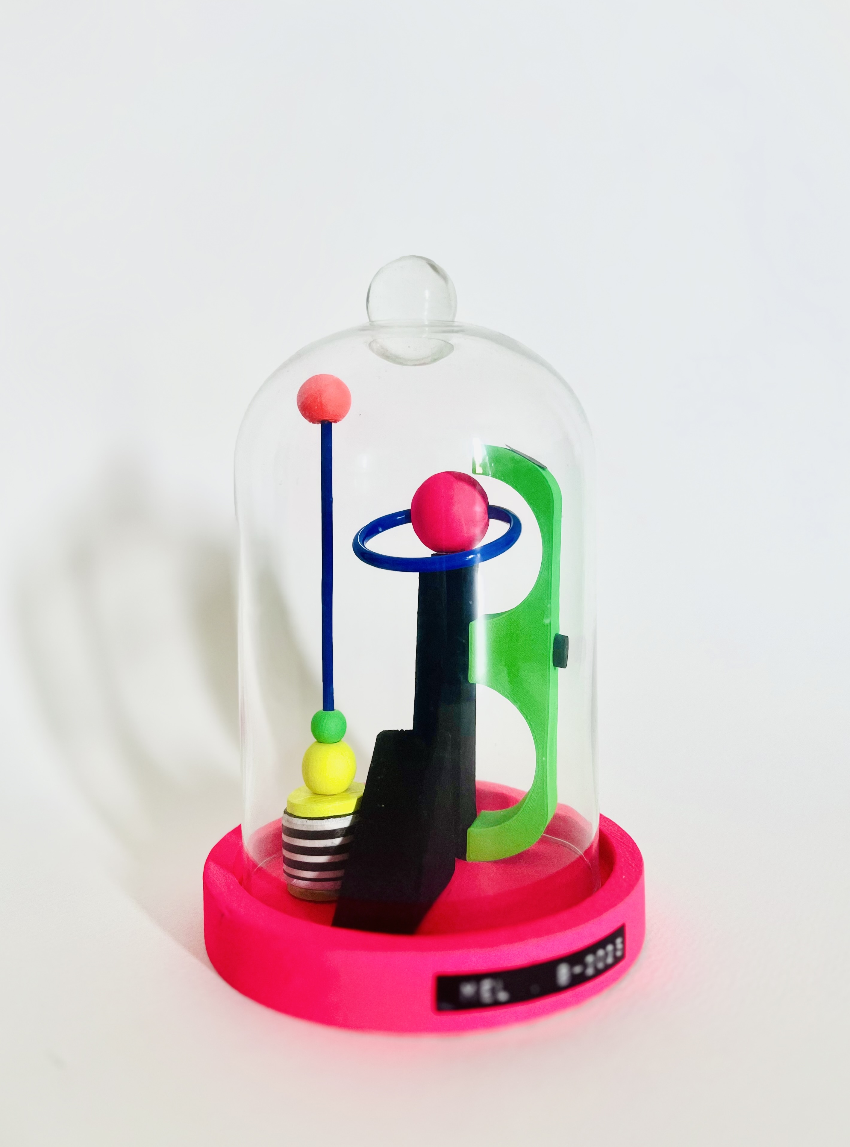 Assemblage abstrait de volumes géométriques noirs et colorés présenté sous cloche de verre